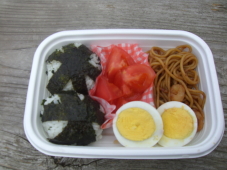 おにぎりとゆで卵と昨夜の焼きそばとトマト( ´,_ゝ`)プッ