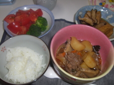 今日は肉じゃがに厚揚げとしいたけの煮物にトマトにブロッコリー。