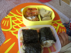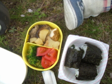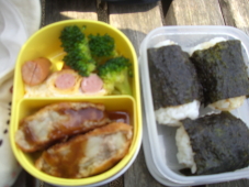 鰹節のお握りに昨夜のコロッケにブロッコリーにソーセージとチーズの卵焼き。