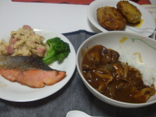 今夜は,ハヤシライスに鮭のムニエルにポテサラにブロッコリーに残りのコロッケ。
