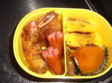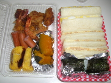 から揚げにエビフライにウィンナーに甘い卵焼きにカボチャの煮物にサンドイッチとおにぎり。