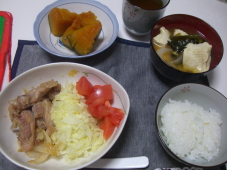 豚のしょうが焼きにかぼちゃの煮物にワカメと豆腐と玉葱のお味噌汁。