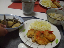昨夜の炊き込みご飯の残りのお握りにタケノコにアジフライにエビフライ。