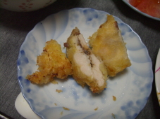 ササミを開いて梅肉ととろけるチーズをのせて,開いた別のササミを重ねて小麦粉・卵・生パン粉で衣を作って揚げるだけ☆