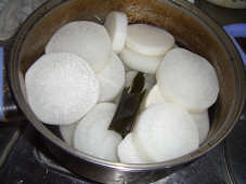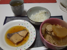 今週は風邪気味の甘えん坊将軍の為に,ネギ生姜週間ヽ(ヽ(゚ヽ(゚∀ヽ(゚∀゚ヽ(゚∀゚)ノ゚∀゚)ノ∀゚)ノ゚)ノ)ノ 鍋に大根と水と出し昆布を入れて炊く。 その中に,鶏ミンチにみじん切りのネギと摩り下ろした生姜を混ぜて粘りが出るまでかき混ぜる。 それを適当な大きさにちぎって。。。 鍋にボチャン(´,_ゝ`)プッ 適当に砂糖と醤油とみりんで味をつけてコトコト煮る。 ひたすら煮る。 こんな感じ♪ 余熱で火を通しながら,ブリの煮付けも作ってみた♪ 昼間,あいちょくんの家でおやつをたくさん食べたのに,大根を半分以上食べたからびっくり!!(゚ロ゚屮)屮 ブリの煮汁にご飯を混ぜたら食が進んだ( ´艸`)ムププ |