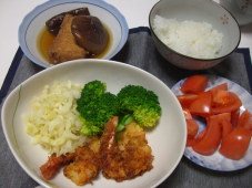 厚揚げを鍋に入れて出しジャコも適当に入れて… 干ししいたけも加えて砂糖と醤油とみりんで味付け。 コトコト炊くだけ♪ それと。。。 エビフライに温野菜ヽ(ヽ(゚ヽ(゚∀ヽ(゚∀゚ヽ(゚∀゚)ノ゚∀゚)ノ∀゚)ノ゚)ノ)ノ はるっちょさんの大好きなトマちゃんも1個丸ごと切って小皿に盛り付けて☆ はるっちょさんたらトマト全部に厚揚げ3分の1にエビフライ2匹尻尾まで食べて,野菜も半分以上食べたよ…(;゜;∀;゜;) それだけ食べたら風邪もすぐに治るよね♪ |